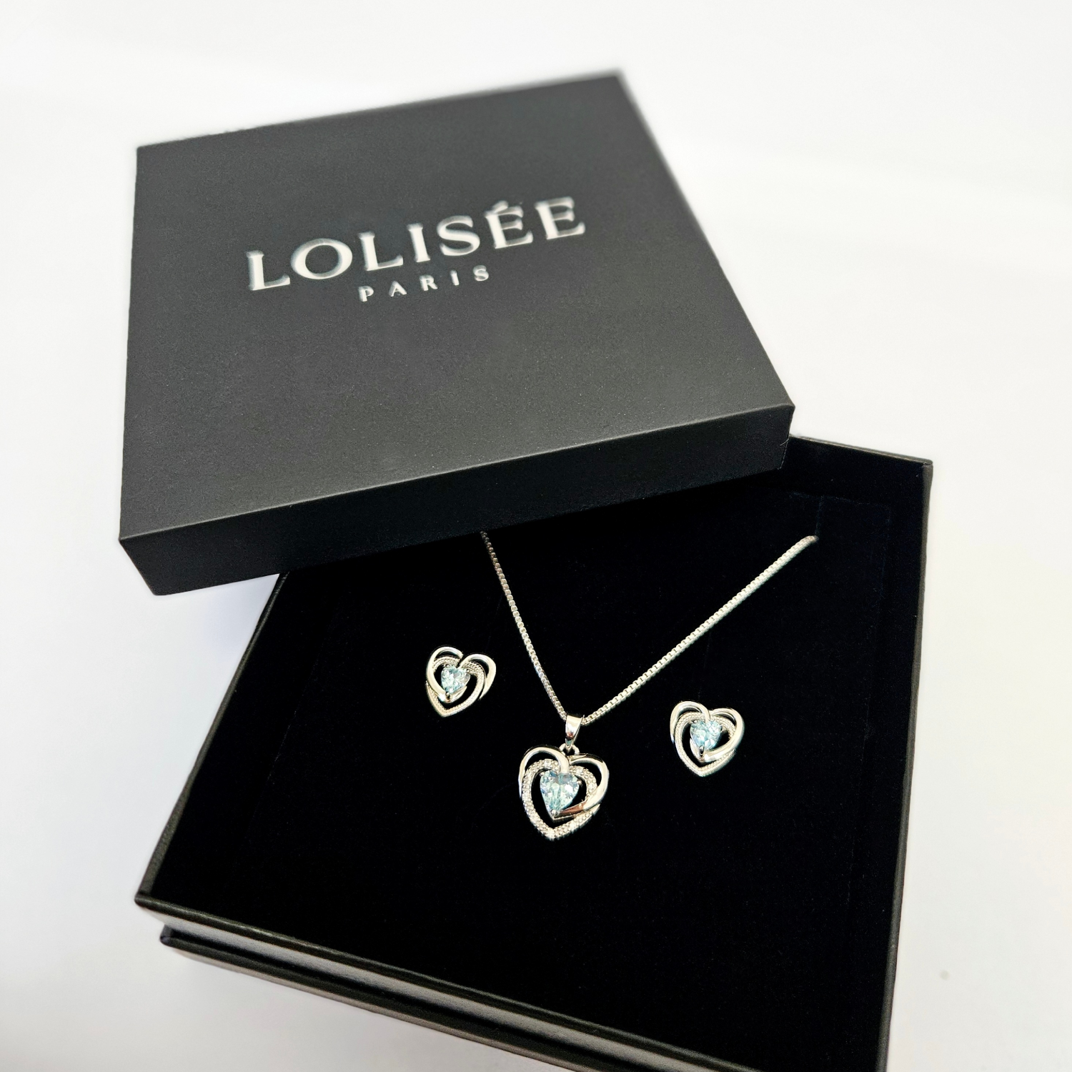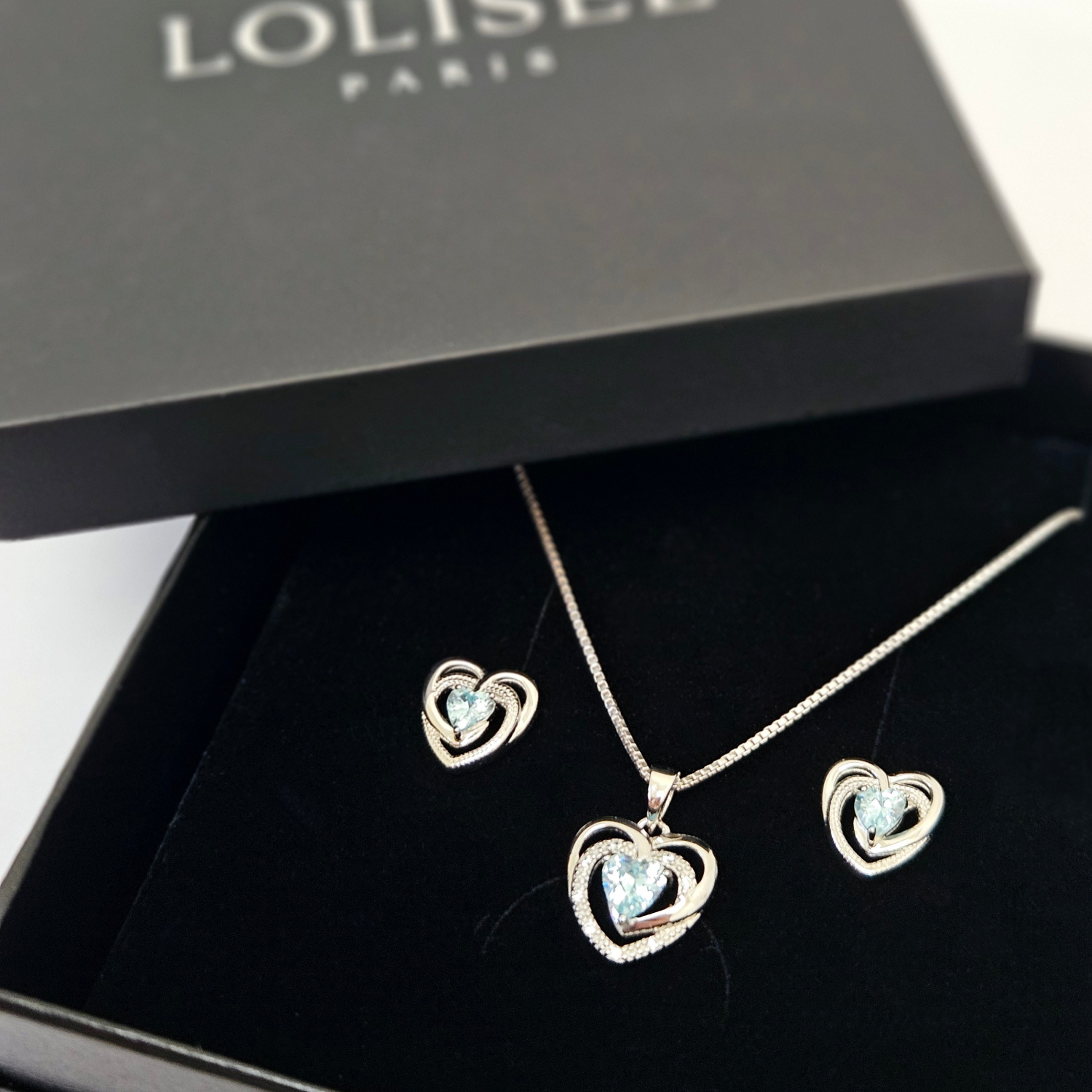 Craquez pour cet ensemble de collier et boucles d’oreilles en coeurs ornés de pierres bleues — des bijoux symbole d’amour et de tendresse.